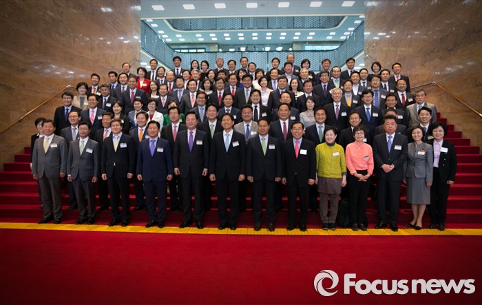 (서울=포커스뉴스) 11일 오후 서울 여의도 국회 로텐더홀 계단에서 20대 국회 초선 당선인들이 전자투표 시연 등 교육을 마친 뒤 기념촬영을 하고 있다.