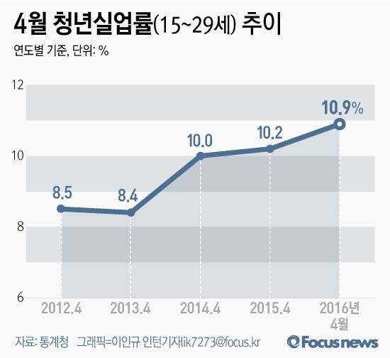 (서울=포커스뉴스) 통계청이 11일 발표한 '4월 고용동향'에 따르면 4월 청년 실업률은 10.9%로 전년 동월 대비 0.7%포인트 증가했다.