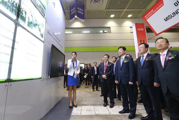 (서울=포커스뉴스) 우태희 산업통상자원부 2차관이 11일 오전 서울 간암구 삼성동 코엑스 C홀에서 열린 '2016 국제 전기전력 전시회'에 참석해 개막식을 알리는 테이프커팅을 한 후 전기전력설비·기자재, 발전·원자력 플랜트 설비·기자재, 스마트그리드 및 관련 시스템, ESS, LED 조명 등 전시업체 전시관을 둘러보고 있다. <사진제공=산업통상자원부>