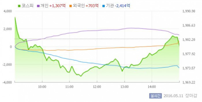 이날 코스피는 전일 대비 0.34% 상승한 1989.17로 장을 시작했다. 그러나 지수는 외국인과 기관의 동반 팔자에 하락세로 방향을 바꿨다.