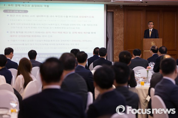 (서울=포커스뉴스) 12일 오전 서울 중구 세종호텔에서 열린 세종포럼에 참석한 정재찬 공정거래위원장이 '2016년 공정거래 정책방향'을 주제로 특강을 하고 있다.
