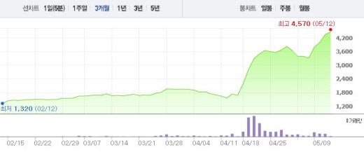 12일 오전 9시46분 현재 뉴보텍은 전일 대비 3.10%(135원) 상승한 4490원에 거래되고 있다. 이는 4월 초 주가(1945원)와 비교했을 때 3배 상승한 수치다. 9일(14.46%), 10일(5.26%), 11일(8.88%) 연달아 상승폭을 기록하면서 주가가 오르고 있다.