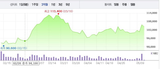 매출은 증가했지만 카카오드라이버, 카카오헤어샵 등 신규 O2O(Online to Offline) 서비스에 대한 투자로 영업비용이 2214억원이 발생하면서 영업이익이 줄어들었다.주가흐름<사진출처=네이버 캡쳐>