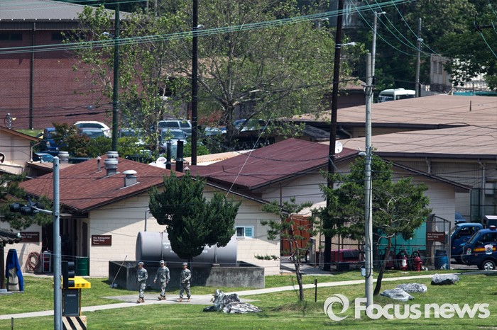 (서울=포커스뉴스) 주한미군이 지카 바이러스 실험을 추진하고 있다는 보도로 논란이 일어난 12일 오전 미군들이 서울 용산구 주한미군기지 내 한 건물 앞을 걷고 있다.