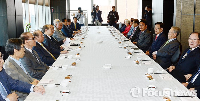 (서울=포커스뉴스) 정진석(오른쪽 네번째) 새누리당 원내대표와 김광림(오른쪽 세번째) 정책위의장 등이 12일 오후 서울 여의도 한 중식당에서 상임고문단과 오찬을 하고 있다.