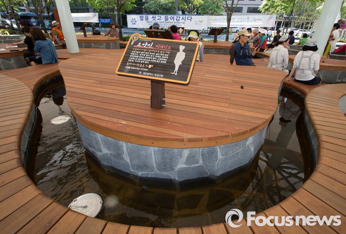 (대전=포커스뉴스) 유성온천문화축제를 하루 앞둔 12일 오전 대전 유성구 유성온천문화공원 족욕장을 찾은 시민들이 족욕을 하고 있다. 유성온천문화축제는 13일부터 15일까지 열리며 국내 최초로 한방족욕카페를 개장해 태양인과 태음인, 소양인, 소음인 사상체질별 맞춤 족욕장을 운영한다.