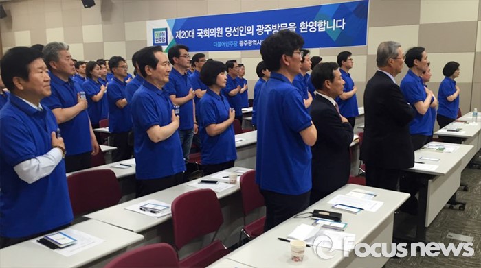 (광주=포커스뉴스) 김종인 더불어민주당 비대위 대표, 우상호 원내대표, 윤장현 광주시장 등 의원 및 당선인들이 12일 오후 광주서구 김대중컨벤션센터에서 열린 20대 국회의원 당선자 워크숍에 참석해 국기에 대한 경례를 하고 있다.