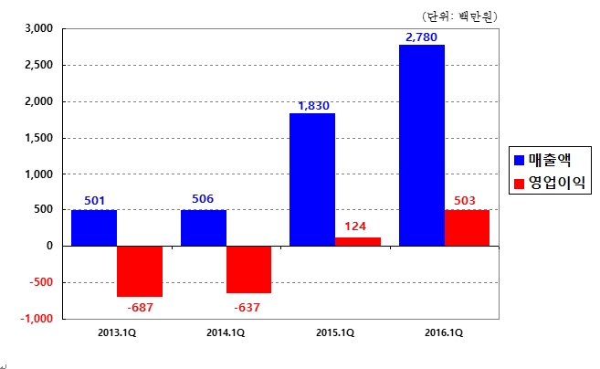 1분기 매출액(별도재무제표 기준)은 전년동기 18억3000만원 대비 52% 증가한 27억8000만원을 달성했고, 당기순이익은 전년동기 4억3000만원 대비 5% 증가한 4억5000만원을 기록했다.