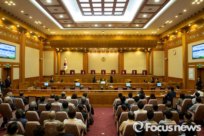 (서울=포커스뉴스) 한글을 우리 고유문자로 규정한 현행법이 헌법에 어긋나는지를 판단하는 '국어기본법 제3조' 등에 대한 공개변론이 12일 오후 서울 종로구 헌법재판소 대심판정에서 열렸다. 이날 변론에 참석한 헌법재판관들이 취재진의 퇴장을 기다리고 있다.