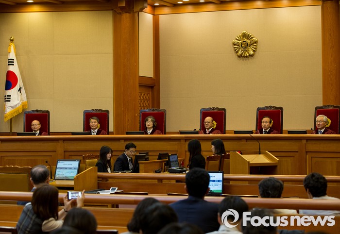 (서울=포커스뉴스) 한글을 우리 고유문자로 규정한 현행법이 헌법에 어긋나는지를 판단하는 '국어기본법 제3조' 등에 대한 공개변론이 12일 오후 서울 종로구 헌법재판소 대심판정에서 열렸다. 이날 변론에 참석한 헌법재판관들이 취재진의 퇴장을 기다리고 있다.