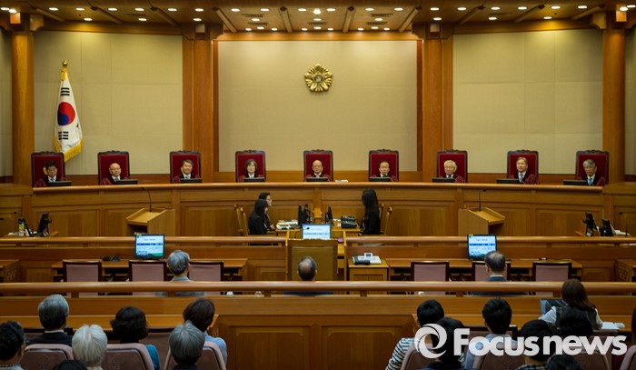 (서울=포커스뉴스) 한글을 우리 고유문자로 규정한 현행법이 헌법에 어긋나는지를 판단하는 '국어기본법 제3조' 등에 대한 공개변론이 12일 오후 서울 종로구 헌법재판소 대심판정에서 열렸다. 이날 변론에 참석한 헌법재판관들이 취재진의 퇴장을 기다리고 있다.