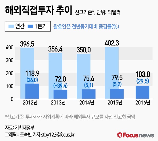 (서울=포커스뉴스) 12일 기획재정부가 공개한 ‘2016년 1분기 해외직접투자 동향’에 따르면 올해 1분기 해외직접투자(신고 기준) 규모는 전년 동기보다 29.5% 늘어난 103억 달러를 기록했다.