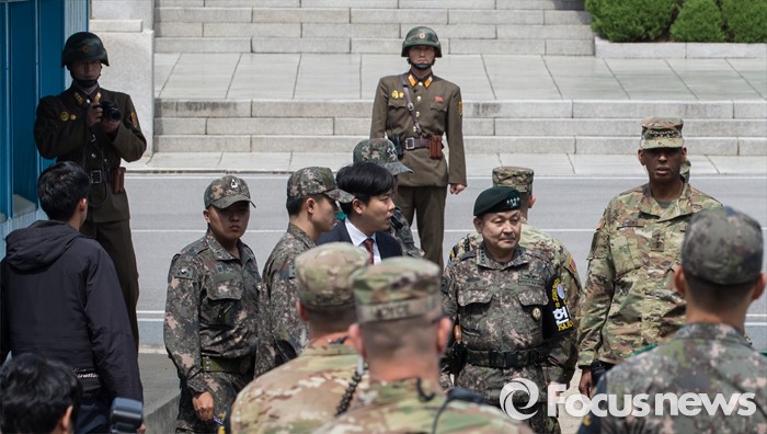 (파주=포커스뉴스) 빈센트 브룩스 신임 한·미연합사령관 겸 주한미군사령관과 이순진 합참의장이 12일 오후 경기도 파주시 판문점 공동경비구역(JSA)을 방문, 북한군 병사들이 미군과 남측 인원들을 주시하고 있다.