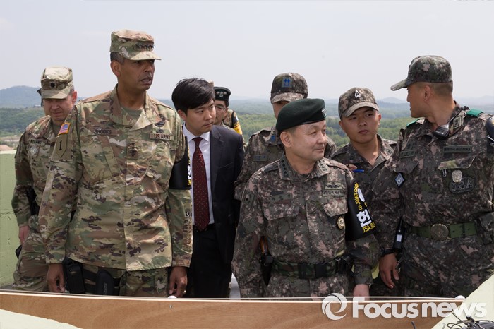 (파주=포커스뉴스) 빈센트 브룩스(앞줄 왼쪽) 신임 한·미연합사령관 겸 주한미군사령관과 이순진(앞줄 가운데) 합참의장이 12일 오후 경기도 파주시 JSA(공동경비구역)를 방문, 오울렛 초소에서 관계자로부터 설명을 듣고 있다.