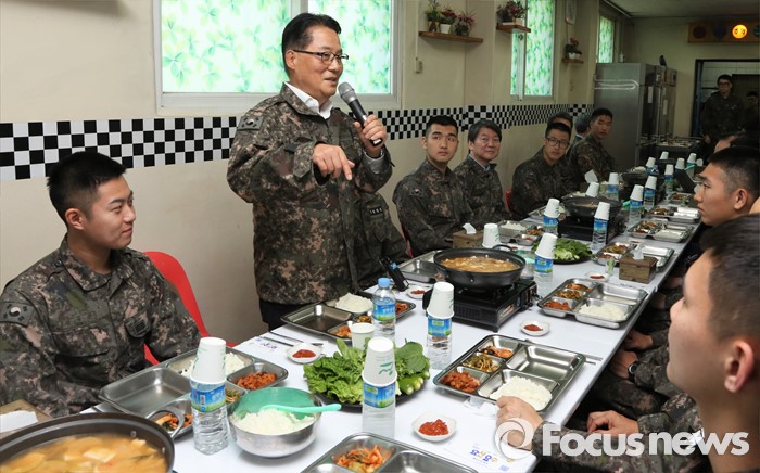 (연천=포커스뉴스) 박지원(왼쪽 두번째) 국민의당 원내대표가 12일 오후 경기도 연천 전방부대를 방문해 장병들과의 오찬에 앞서 인사말을 하고 있다.