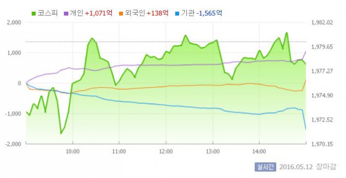 이날 코스피는 전일 대비 0.34% 하락한 1973.28로 장을 시작했다. 이후 지수는 기관의 대규모 매도세에 1970선 중후반에서 등락을 반복했다. 기관은 1561억원 어치를 내다팔며 지수 하락세를 주도했다.