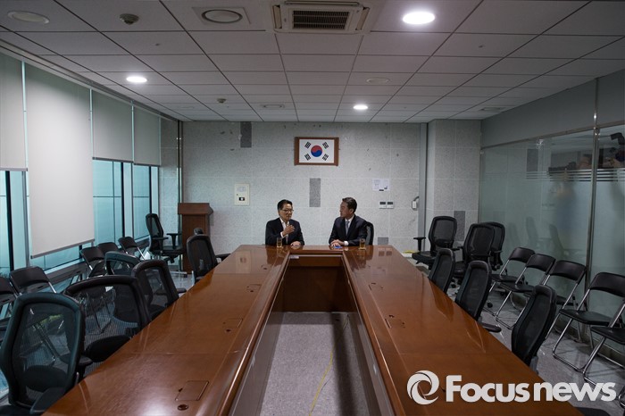 (서울=포커스뉴스) 박근혜 대통령과 3당 원내대표의 회담을 앞두고 현기환(오른쪽) 청와대 정무수석이 12일 오후 서울 여의도 국회의원회관에서 박지원 국민의당 원내대표와 면담에 앞서 악수 하고 있다.