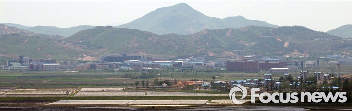 (파주=포커스뉴스) 36년 만에 열린 북한의 제7차 노동당 대회에서 김정은 국방위원회 제1위원장이 노동당 위원장으로 취임했다. 이번 당대회는 김정은의 독재를 더욱 공고히 하기 위한 우상화 노선의 연장선이라는 평가가 나오고 있다. 사진은 12일 오후 경기도 파주시 공동경비구역(JSA) 오울렛 초소에서 바라본 북한 개성공단의 모습.