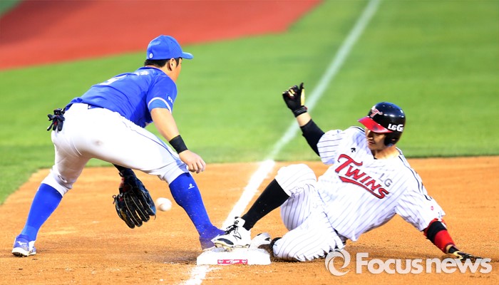 (서울=포커스뉴스) 12일 서울 잠실구장에서 열린 2016 프로야구 삼성-LG 경기 3회말 1사후 LG 손주인이 좌중간으로 빠지는 타구를 날리고 3루에서 세이프되고 있다.
