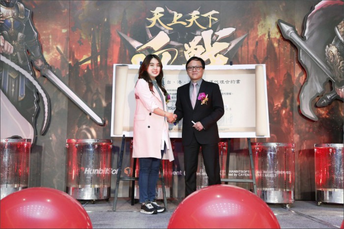김유라 한빛소프트 대표는 "천지를 베다는 중화권 시장에서 통할 수 있는 좋은 컨텐츠라고 생각한다"며 "삼국지를 소재로 했으면서도 차별성과 독특함, 그리고 시원시원한 액션까지 겸비한 천지를 베다가 해외 시장에서 뒷심을 발휘할 기회가 될 것"이라며 밝혔다.르 메르디안 타이페이 호텔에서 열린 천지를 베다 대만 미디어 간담회장에서 한빛소프트 김유라 대표(좌)와 카이엔아크 등윤택 회장(우)이 악수를 나누는 모습. <사진제공=한빛소프트>