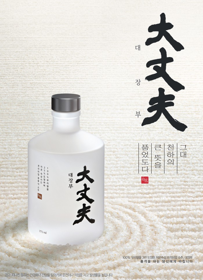 롯데주류 관계자는 "희석식 소주인 '처음처럼'이 굳건히 자리잡은 만큼 증류식 소주시장에도 좋은 제품을 선보이고자 '대장부'를 기획하게 됐다"며 "격식을 갖추는 자리에서 '대장부'를 즐길 수 있도록 다양한 마케팅을 진행할 계획"이라고 말했다.대장부.<사진제공=롯데주류>