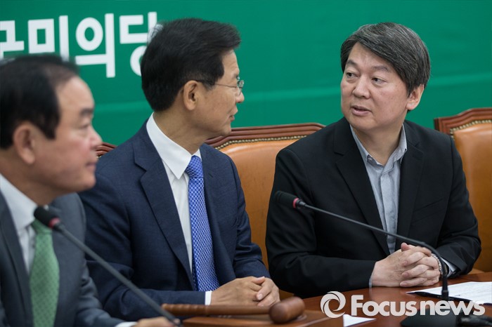 (서울=포커스뉴스) 안철수(오른쪽), 천정배 국민의당 상임공동대표가 13일 오전 서울 여의도 국회에서 열린 최고위원회의에 참석해 대화를 나누고 있다.