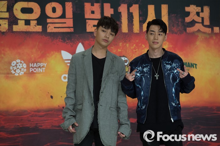 (서울=포커스뉴스) 13일 오전 서울 영등포구 타임스퀘어 아모리스홀에서 열린 Mnet '쇼미더머니5' 제작발표회에 참석한 래퍼 사이먼도미닉과 그레이가 포토타임을 갖고 있다.