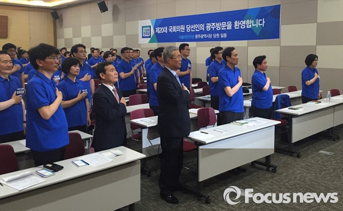 한편, 더민주 워크숍에는 당선인 123명 가운데 115명이 참석했다. 또 박원순 서울시장과 이낙연 전남지사 등이 방문하기도 했다.김종인 더불어민주당 비대위 대표, 우상호 원내대표, 윤장현 광주시장 등 의원 및 당선인들이 12일 오후 광주서구 김대중컨벤션센터에서 열린 20대 국회의원 당선자 워크숍에 참석해 국기에 대한 경례를 하고 있다. 2016.05.12 박기호 기자