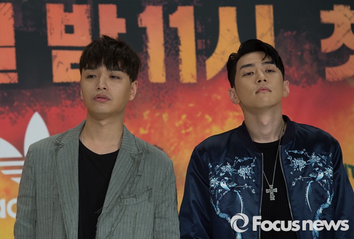 (서울=포커스뉴스) 13일 오전 서울 영등포구 타임스퀘어 아모리스홀에서 열린 Mnet '쇼미더머니5' 제작발표회에 참석한 래퍼 사이먼도미닉과 그레이가 포토타임을 갖고 있다.