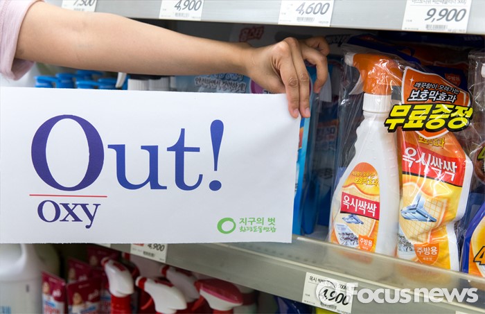 (서울=포커스뉴스) 13일 오전 서울 중구 롯데마트 서울역점에서 환경운동연합과 가습기 살균제 피해자 가족모임이 '옥시 제품 즉각 판매 중단'을 촉구하고 있다.
