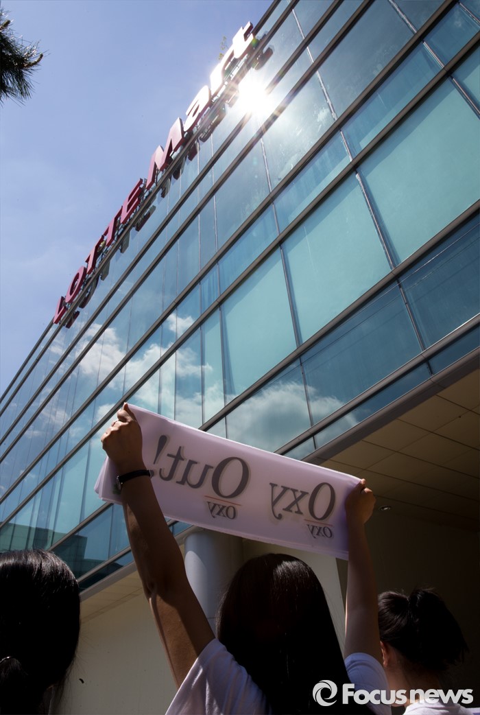 (서울=포커스뉴스) 13일 오전 서울 중구 롯데마트 서울역점 앞에서 환경운동연합과 가습기 살균제 피해자 가족모임이 '옥시 제품 즉각 판매 중단'을 촉구하고 있다.