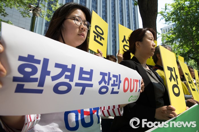 (서울=포커스뉴스) 13일 오후 서울 종로구 정부서울청사 후문에서 가습기살균제피해자와가족모임을 비롯한 시민단체 회원들이 '윤성규 환경부 장관 해임 요구 기자회견'을 하고 있다.