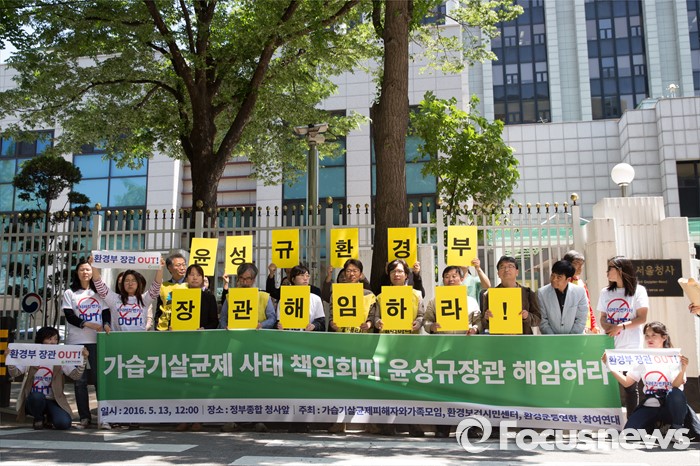 (서울=포커스뉴스) 13일 오후 서울 종로구 정부서울청사 후문에서 가습기살균제피해자와가족모임을 비롯한 시민단체 회원들이 '윤성규 환경부 장관 해임 요구 기자회견'을 하고 있다.