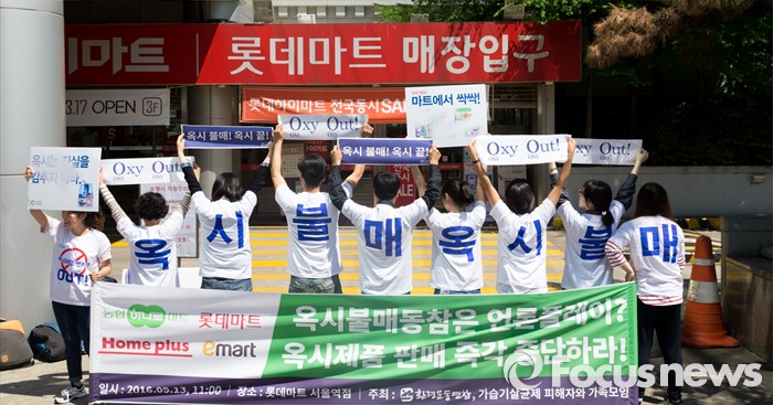 기자회견 뒤 환경운동연합과 가피모는 롯데마트 서울역점 매장 내 옥시제품 판매대에서 옥시제품 불매 퍼포먼스를 진행했다.13일 오전 서울 중구 롯데마트 서울역점 앞에서 환경운동연합과 가습기 살균제 피해자 가족모임이 '옥시 제품 즉각 판매 중단'을 촉구하고 있다. 2016.05.13 김인철 기자 13일 오전 서울 중구 롯데마트 서울역점에서 환경운동연합과 가습기 살균제 피해자 가족모임이 '옥시 제품 즉각 판매 중단'을 촉구하고 있다. 2016.05.13 김인철 기자