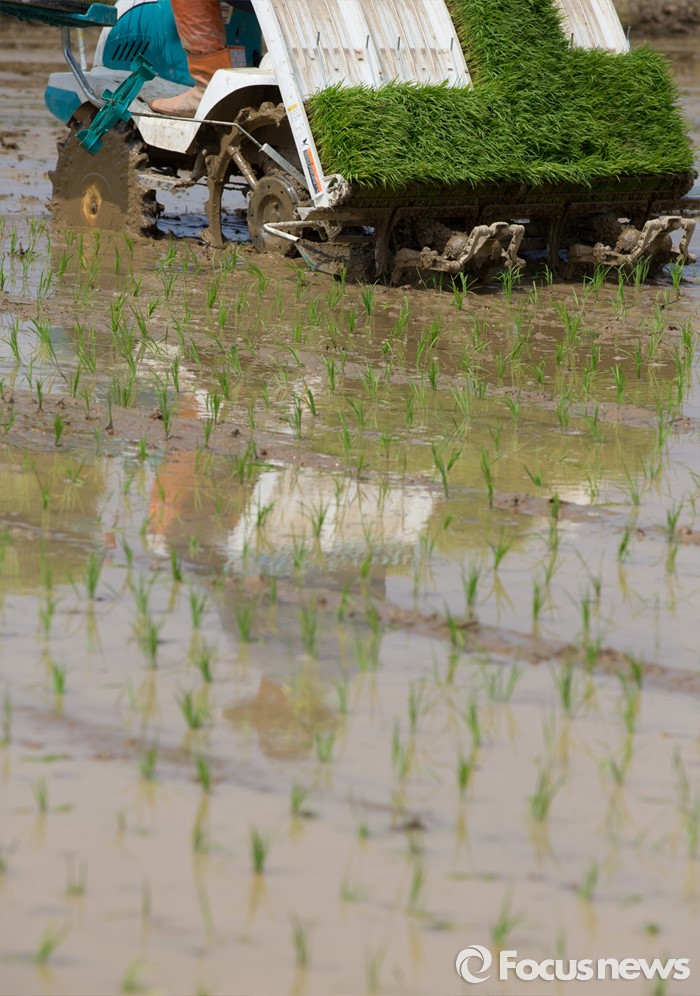 (청주=포커스뉴스) 13일 오후 충북 청주시 서원구의 한 논에서 농민이 이양기를 이용해 모내기를 하고 있다.
