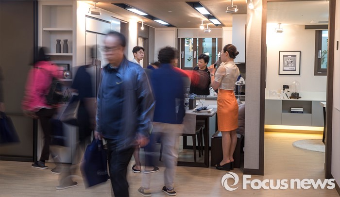 (서울=포커스뉴스) 이달 6만 8천여 가구라는 물량이 쏟아져 5월 분양전쟁이 예상되는 가운데 서울 용산구 효창동 KCC 스위첸 견본주택이 방문한 시민들로 붐비고 있다.