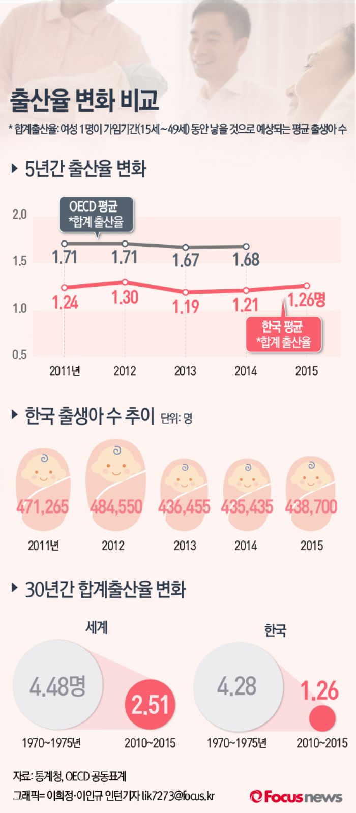 (서울=포커스뉴스) 통계청 자료에 따르면 2015 우리나라 합계출산률은 1.26명으로 전년대비 소폭 상승했으나 세계 및 OECD의 수치에는 부족하다.