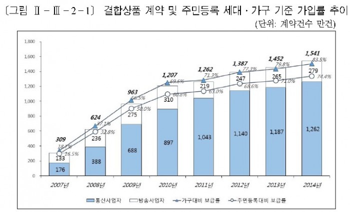 결합상품은 통신사를 바꿀 때 혜택이 없어지기 때문에 고객들의 해지율을 낮추는데 효과가 있다. 지난해 결합상품 가입자는 1200만명으로 3년 전보다 50% 올랐고 지속적인 증가추세에 있다. 방송통신사들이 결합상품의 주도권을 빼앗기기 싫어하는 것은 당연한 일이다.