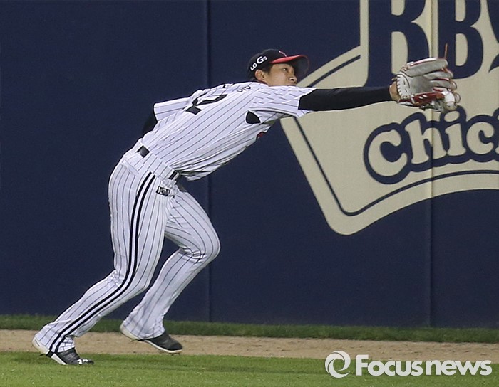 (서울=포커스뉴스) 13일 서울 잠실구장에서 열린 2016 프로야구 SK-LG 경기 6회초 1사 1루에서 LG 우익수 이천웅이 SK 이재원의 외야 뜬공을 달려가며 잡고 있다.