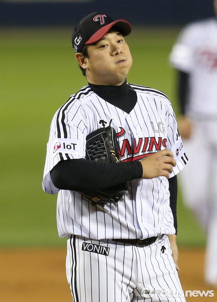 (서울=포커스뉴스) 13일 서울 잠실구장에서 열린 2016 프로야구 SK-LG 경기 6회초 1사 1루에서 LG 투수 류제국이 SK 이재원을 우익수 플라이로 잡고 한숨을 돌린듯 볼 풍선을 불고 있다.