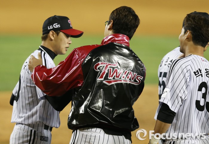 (서울=포커스뉴스) 13일 서울 잠실구장에서 열린 2016 프로야구 SK-LG 경기에서 2-1 승리를 한 LG 류제국이 마무리투수 임정우를 환영하고 있다.