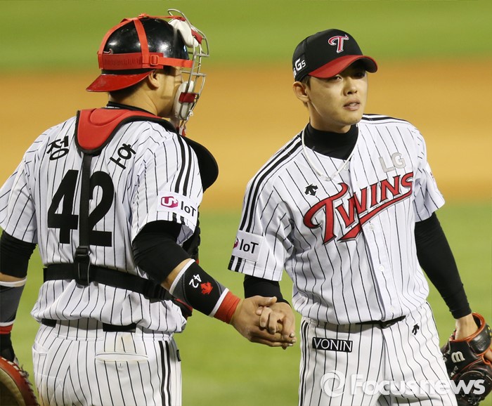(서울=포커스뉴스) 13일 서울 잠실구장에서 열린 2016 프로야구 SK-LG 경기에서 SK를 2-1로 물리친 LG의 마무리 투수 임정우와 포수 정상호가 하이파이브하고 있다.