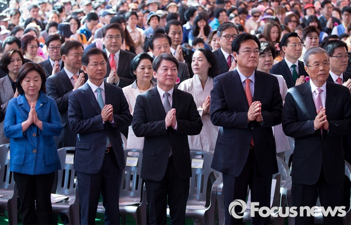 (서울=포커스뉴스) 14일 오전 서울 종로구 조계사 대웅전에서 열린 불기 2560년 부처님 오신날 봉축 법요식에서 내빈들이 합장하고 있다. 오른쪽부터 김종인 더불어민주당 비대위 대표, 정진석 새누리당 원내대표, 안철수 국민의당 상임공동대표, 천정배 국민의당 공동대표, 심상정 정의당 대표.