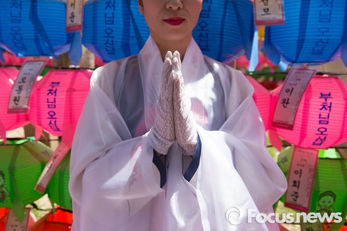 (서울=포커스뉴스) 14일 오전 서울 종로구 조계사 대웅전에서 열린 불기 2560년 부처님 오신날 봉축 법요식에서 한 불교신자가 합장하고 있다.