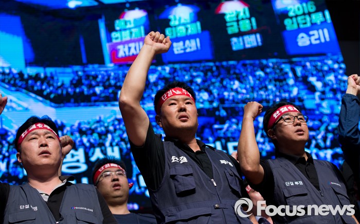 (서울=포커스뉴스) 14일 오후 서울 강서구 KBS스포츠월드에서 성과연봉제 저지를 위한 금융공기업지부 합동 대의원대회에 참석한 금융노조 조합원들이 구호를 외치고 있다.