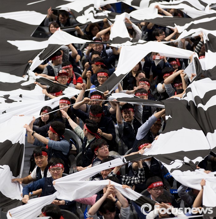 (서울=포커스뉴스) 14일 오후 서울 강서구 KBS스포츠월드에서 성과연봉제 저지를 위한 금융공기업지부 합동 대의원대회에 참석한 금융노조 조합원들이 총파업을 결의하는 상징의식으로 천을 찢고 있다.