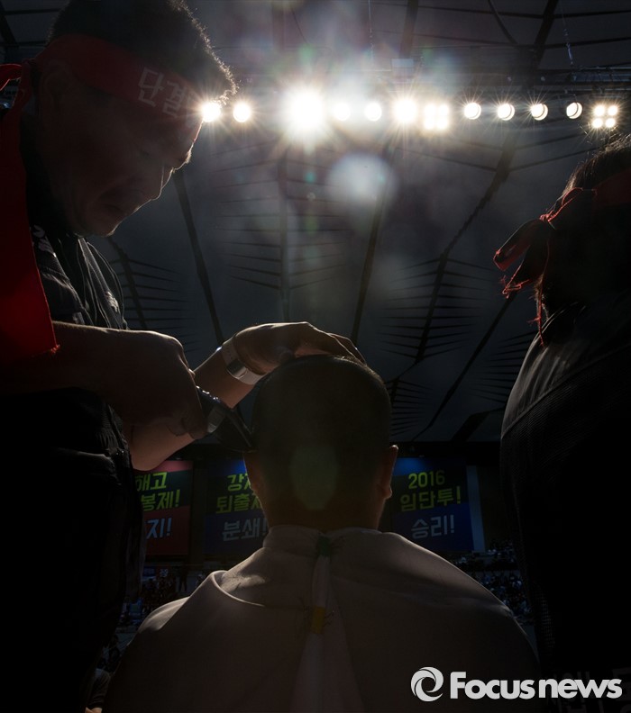 (서울=포커스뉴스) 14일 오후 서울 강서구 KBS스포츠월드에서 성과연봉제 저지를 위한 금융공기업지부 합동 대의원대회에 참석한 김문호 금융노조 위원장과 금융공기업 지부 위원장들이 총파업을 결의하며 삭발식을 하고 있다.