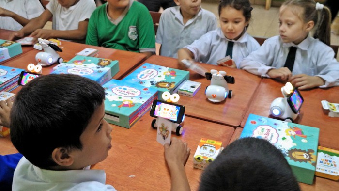 김성한 SK텔레콤 디바이스 기획본부장은 "우리나라의 소프트웨어 교육이 아시아와 유럽을 넘어 중남미 등 전 세계로 확산되고 있다"며, "정부 관련 부처와 협력해 스마트로봇 코딩스쿨을 우리나라 대표적인 창조경제 수출 상품으로 성장시켜 나갈 계획"이라고 밝혔다.사진은 센트럴주의 한 초등학교에서 스마트로봇 알버트를 활용한 교육을 받고 있는 학생들의 모습. <사진제공=SK텔레콤>
