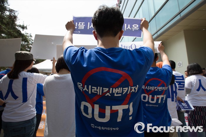 (서울=포커스뉴스) 15일 오전 서울 용산구의 한 대형마트 앞에서 환경운동연합원들이 옥시 불매를 촉구하며 기자회견을 하고 있다.