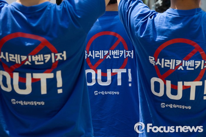 (서울=포커스뉴스) 15일 오전 서울 용산구의 한 대형마트 앞에서 환경운동연합원들이 옥시 불매를 촉구하며 기자회견을 하고 있다.
